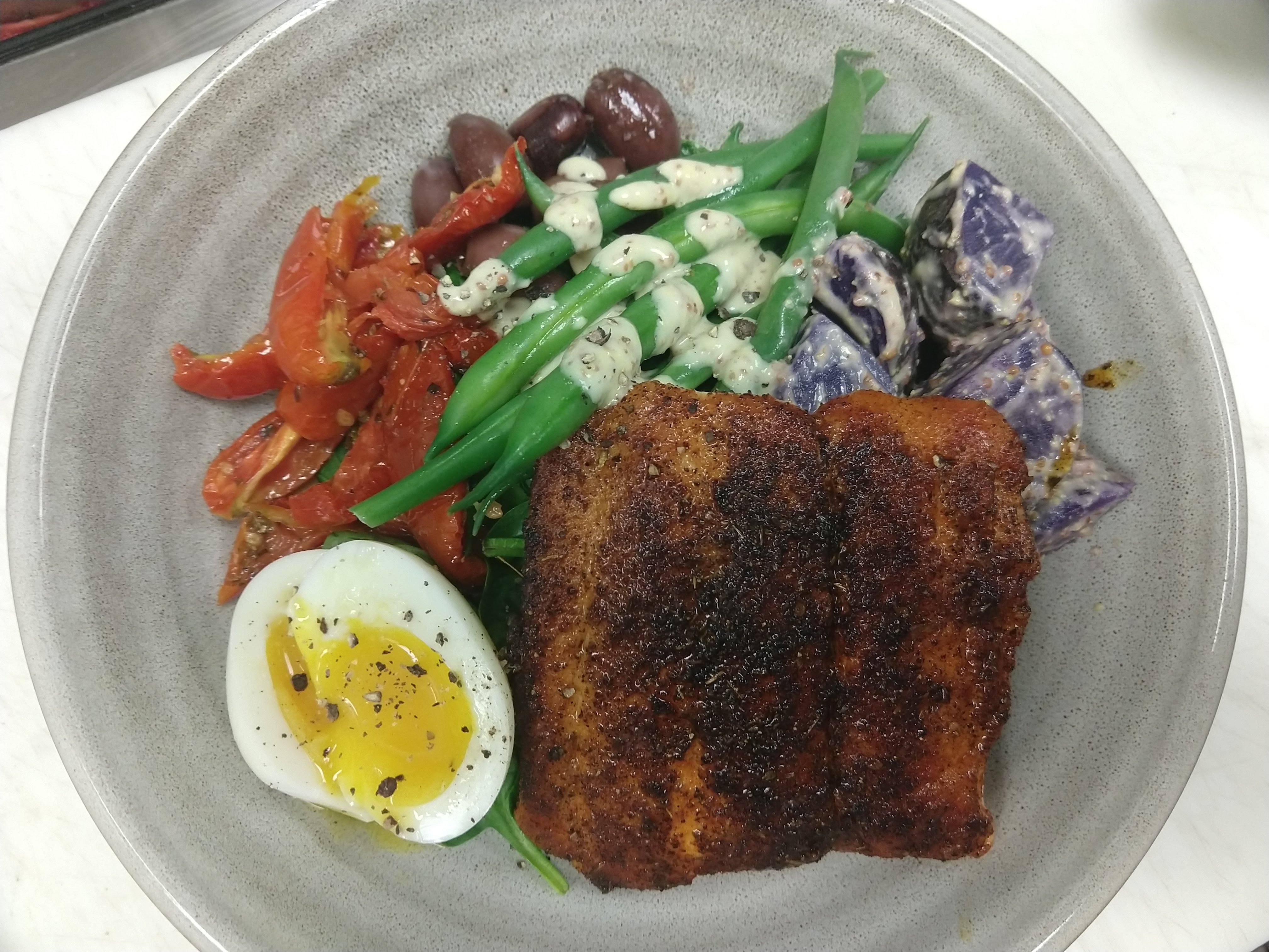 smoked salmon nicoise, rainbow fingerling, sun dried toms, haricot verts, egg, dill citrus vin